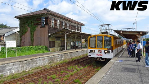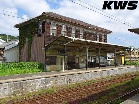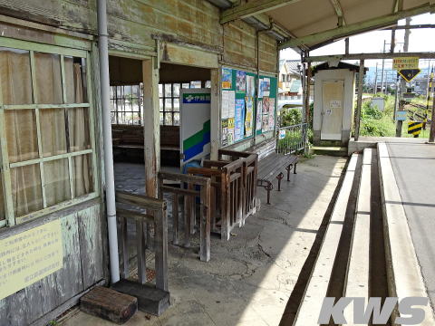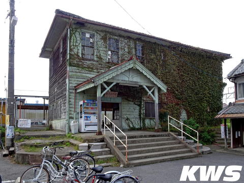 【撮影日:16.10.07./掲載日:26.02.12.】 当駅の駅舎は、湖南鉄道が当駅の開業から9年後の1922(大11)年に建てられたものという。当時は湖南鉄道、のちに八日市鉄道の本社を兼ねた木造の建物であったが、現在は写真の駅舎の右側にあったという平屋部分が解体され、2階建ての直方体の部分だけが残されている。 灰緑色の名駅舎として知られているが、訪問当時は正面の右半分が蔦で覆い尽くされており、特徴である縦長の窓も見えない状態になっていた。でも正直言ってこの蔦の覆い方は綺麗とはいえずもったいない。少しは手入れした方がいいように思うが…、お金の問題があるから放置されているんだろうなぁ。私の訪問後も蔦は繁茂を続けてたようだが、最近は根元の部分が切られて、枯れた蔦が壁に貼り付いた状態になっているようだ。 訪問当時の当駅の営業は平日のみで時間限定となっていた。 |
