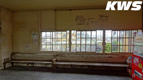 【撮影日:16.10.07./掲載日:26.02.12.】 窓口とは180度反対側の待合所の様子。広告類などがなく、これが建物の状態が解りさっぱりしていいと感じるか、雑然としたものがなく寂しいと感じるか、評価が分かれるところだ。ただ年季が入って味わいを感じる駅舎であることには間違いない。 |