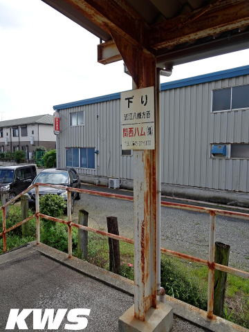 【撮影日:16.10.07./掲載日:26.02.12.】 駅舎から下りホームへ向かうには構内踏切を渡る必要がある。そこで目にするのは「下り近江八幡方面/関西ハム(株)」と書かれた看板。駅ホームに掲げる看板としては小さなモノだが、そこがまたレトロさを感じてしまう。 ちなみに関西ハムという会社だが、名前だけを聞くと大手っぽく感じてしまうが、正式名称は「ミートショップ関西ハム」という、ハム、ソーセージ、近江牛などを販売する、武佐駅最寄りの近江八幡市にある小さな会社である。 |