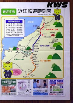 【撮影日:16.10.07./掲載日:26.01.11.】 駅に置かれていた近江鉄道の駅時刻表。大きさはA3用紙を2面折りにした状態で、1ページ目には近江鉄道の地図、内側となる2・3ページ目には本線の、4ページ目には八日市線の駅時刻表が印刷されている。表紙には「東近江市 近江鉄道時刻表」とあるので、もしかしたらこれは近江鉄道ではなく、東近江市が用意したものかもしれない。画像は1ページ目と4ページ目となる。 現在の東近江市は2005(平17)年2月に1市4町、翌年1月に2町を編入して成立している。東近江市にある駅を旧市町ごとに分けると、旧・八日市市域には河辺の森・八日市市・長谷野・大学前・新八日市・太郎坊宮前・市辺・平田、旧・五個荘町域には五箇荘(自治体と駅名で漢字が異なる)、旧・蒲生町域には京セラ前・桜川・朝日大塚・朝日野の近江鉄道の各駅、旧・能登川町域には能登川のJR駅がある。旧・永源寺町・愛東町・湖東町は駅ナシだが、かつて八日市鉄道(現・近江鉄道八日市線)は旧・山上村(旧・永源寺町域の一部)方面に路線延長する計画を持っていた。 左の画像はクリックすると拡大表示します(左右のページは別々のリンクになっています)。 |