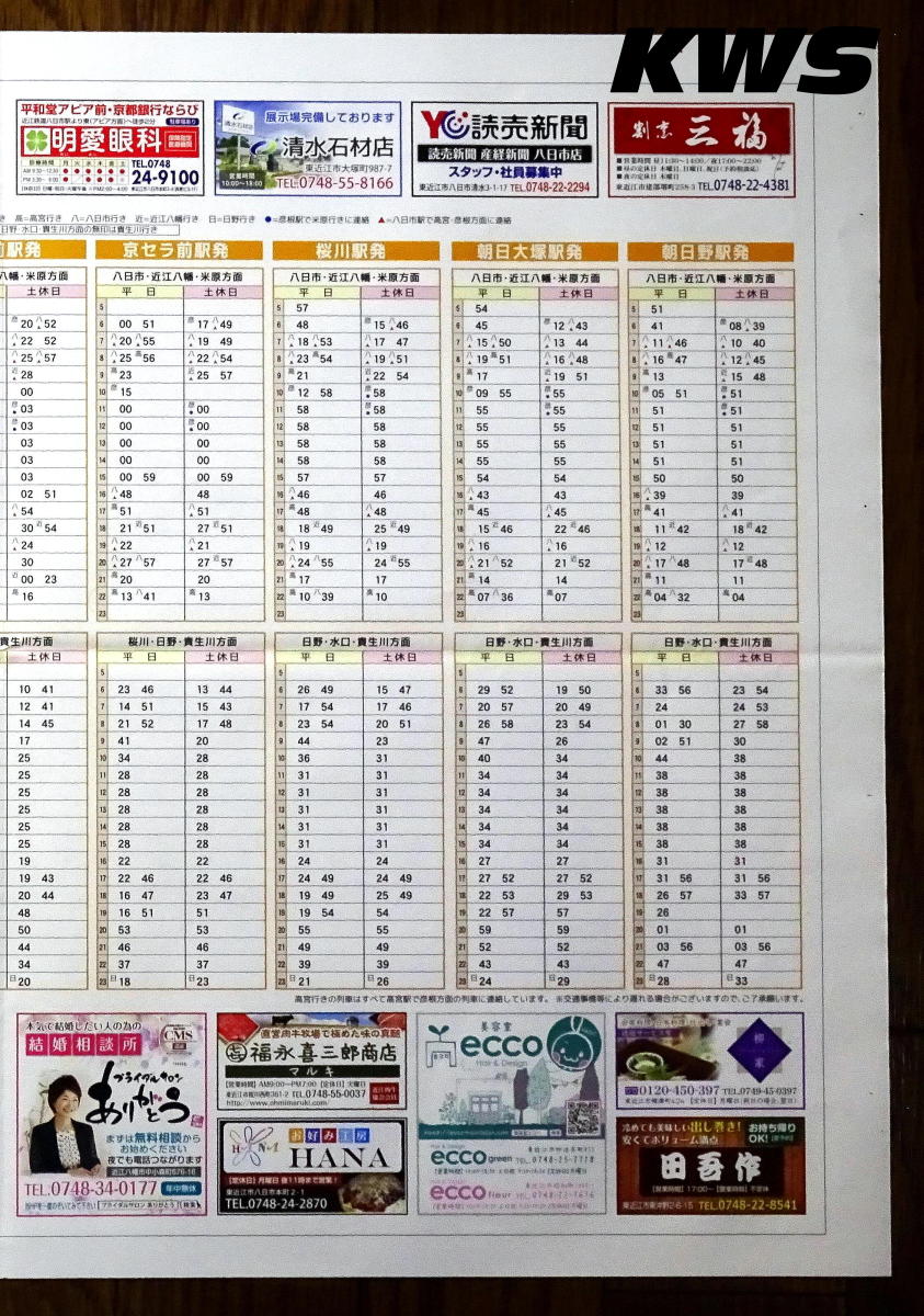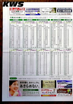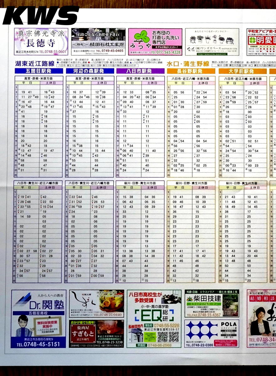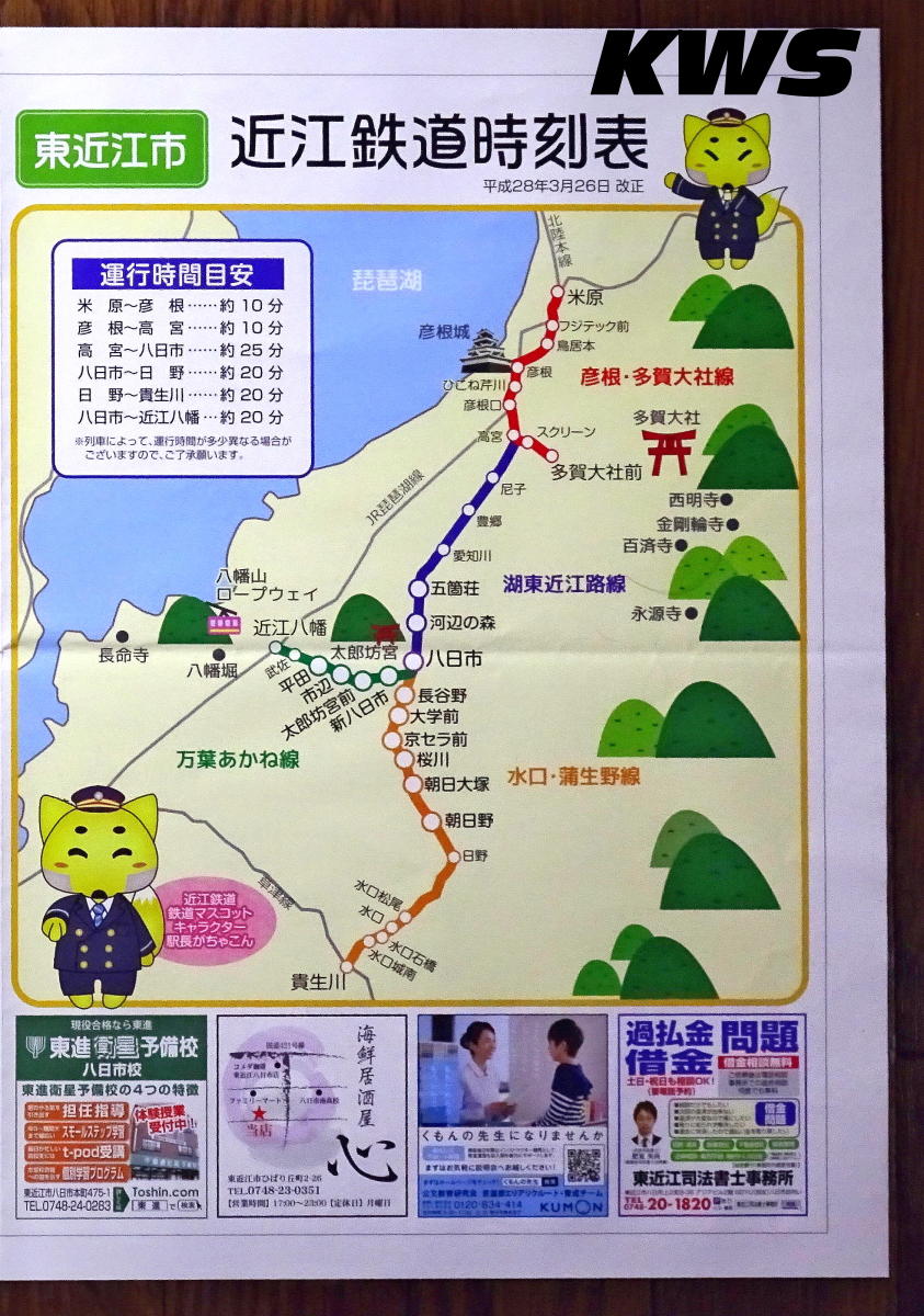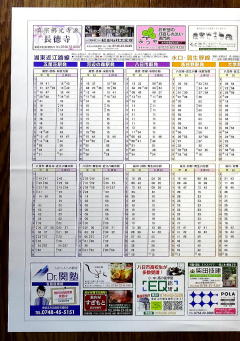 【撮影日:16.10.07./掲載日:26.01.11.】 画像は2ページ目と3ページ目となる。 近江鉄道のダイヤを見ていて特徴的なのは、3方向に線路が延びている八日市駅に対して、米原・彦根・高宮-貴生川間列車と米原・彦根・高宮-近江八幡間列車が設定されている他に、近江八幡-貴生川間という八日市駅で進行方向を変える列車それなりに設定されているというところだ。そこに八日市駅始発・終着駅の列車も当然混ざるので、ダイヤを追っかけて見るには楽しいダイヤである。そうする理由としては、効率よく彦根駅にある車庫との編成の入れ替えを効率的に行うという意味が大きいのだろう。 ちなみに東近江市の最南端となる駅である朝日野駅は、駅の所属は東近江市となっているが、敷地の南側は日野町に跨がっている。 左の画像はクリックすると拡大表示します(左右のページは別々のリンクになっています)。 |