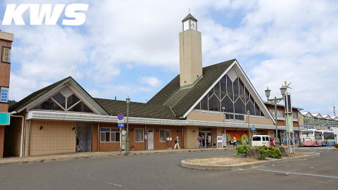 【撮影日:16.10.07./掲載日:26.01.11.】 1998(平10)年に完成した当駅の駅舎は非常に横長で、尖塔のような時計塔が特徴的である。建屋中央の大きな三角屋根部分が駅部分になる。写真左側の小さい三角屋根部分には公共トイレがあり、駅とトイレの間は何かは不明。その写真右の2階建て部分には、(増築されたと思われる波形の屋根部分を含む)1階には店舗が入居できるく区画があり、2階が東近江市の有料駐輪場となっている。またこの訪問当時にはなかったが、現在その2階の手前側は2019(平31)年に彦根駅から移転してきた「近江鉄道ミュ-ジアム」となっている。 |