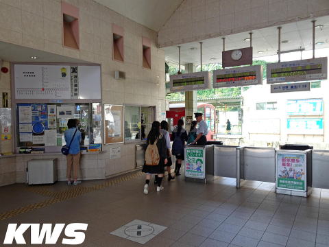 【撮影日:16.10.07./掲載日:26.01.11.】 分岐駅ということもあり、改札口上部には3方面へのLED列車案内板(掲載日現在は3つともLCD表示?に更新されている)が設置されている。窓口自体も場所を大きく取られて寄り、自動改札が無いところ以外は、大都市近郊の有人駅と変わらない感じだ。東近江市の代表駅となっているだけの格はあるといったところだ。風呂桶とも称される金属製の改札口ラッチが複数あるのは、今となっては貴重な存在かもしれない。 |