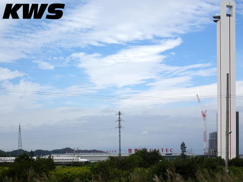 【撮影日:16.10.08./掲載日:25.10.29.】 ホームからは、フジテックのエレベータの試験塔とその前を通る東海道新幹線の線路が見える。写真は米原に停車するため速度を落としている新幹線と組み合わせて撮影したもの。写真にしたら絵になるかと思っていたが、ただ空が広がるだけの写真になってしまった。 |