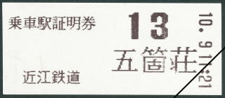 【入手日:16.10.09./掲載日:25.11.19.】 同じ読みではあるが、駅名は「五箇荘」と書き、東近江市と合併する以前の当地の自治体(町)は「五個荘」と書く。 歴史的な観点から行くと、古来よりは"箇"の字が使用されていた。"個"については1889(明22)年の町村制施行時に二つの村がこの表記(北五個荘村、南五個荘村)を採用したのが始まりとのこと。ここでなぜ漢字を変えたのかは不明だ。現在の駅より米原側にあった小幡駅を移転させて開業したのは1910(明43)年のことになるが、この際に駅名は"箇"の字が使われた。自治体名と駅名で漢字が不一致となるケースはまま見られることではあるが、当駅は結果的に自治体名には合わせなかったということになる。こちらも理由は定かではないが、新しい漢字より馴染みがある漢字が採用されたということになるのだろうか。 ちなみに字義的な観点から行くと、"箇"も”個”も数詞として使われる昔からある漢字で、カウントされるものも差別されておらず、意味として変わらないという。しかし日本では"箇"の方が古来から一般的に使用されていたとのこと。 |