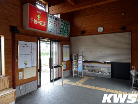 【撮影日:16.10.09./掲載日:25.11.19.】 駅は無人駅ということもあり、ひっそりとしているが、木の壁のおかげで多少は温かみ感があるのは救いだ。 写真の正面は窓口があるように見えるが、下部が何かのショーケースとなっているので、窓口というわけでもなさそうだ。 豊郷駅でも思ったのだが、「午後の紅茶」の広告がやけに気になってしまう(笑)。 |