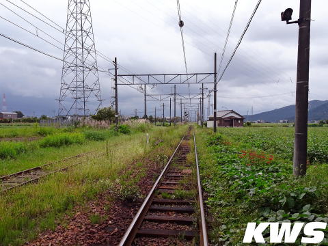 【撮影日:16.10.09./掲載日:25.11.19.】 五箇荘駅には貴生川側で本線から分岐する側線がある(右が本線、左が側線)。かつては愛知川から砂利を採取するために戦中に建設されたいわゆる"砂利線"だったが、現在では河原に近い部分の線路は剥がされたものの、線路のバラストやレールを運び込むための工臨列車が走る線路として現役である。とはいっても工臨が走行する機会は年数回とかなり稀のようだ。かつては電気機関車牽引だったが、その後は事業用車として残されている単行電車の220形が貨車を牽引しており、この側線を運転する際は、220形を米原側に連結してプッシュで貨車を押し込んでいたそうだ。しかし最後に残されていた220形226は2024(令6)年に廃車となっており、現在はどのような運転がなされているのであろうか。 |