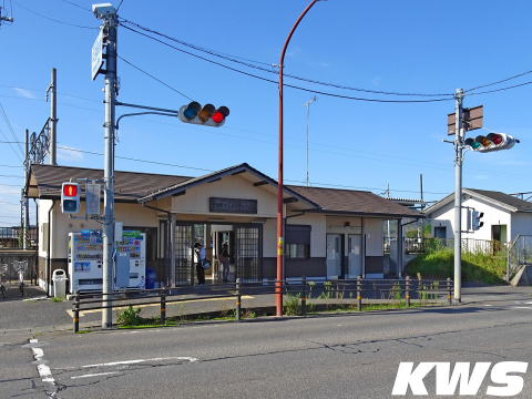 【撮影日:16.10.07./掲載日:25.11.08.】 駅舎は丁字路の交差点に面頭向かって建てられている。訪問したのが平日の朝の時間帯だったこともあって車通りもそれなりにあり、車列が切れる瞬間を狙ってやっと撮ったものと記憶している。 |