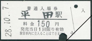 【入手日:16.10.07./掲載日:25.11.08.】 掲載日現在、当駅と同じ漢字を使う駅が他の3つある(三陸鉄道リアス線、JR篠ノ井線、土佐くろしお鉄道宿毛線)。ただ読みは、三陸鉄道だけ”へいた”だが、他は"ひらた"である。大井川鐵道井川線に「ひらんだ」駅は漢字で書けば"平田"だそうだが、投稿日現在の住所表記には見えない。 |