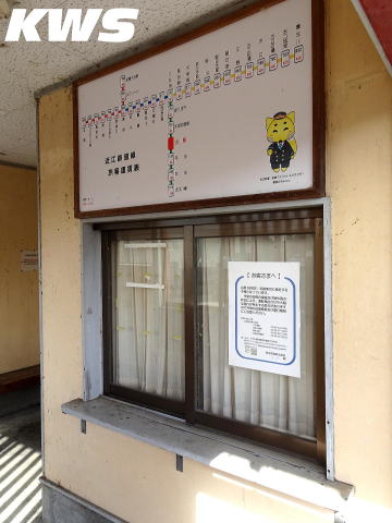 【撮影日:16.10.07./掲載日:26.04.18.】 簡素な駅舎内には窓口が設けられているが、私が訪問した当時は終日無人化されていたので、この窓口は開くことは無いのだろう。 窓口のガラスには、台風18号に伴う遅延や運休のおそれを予告する張り紙が貼られていた。ただこの撮影時点ではこの件は既に無事に過ぎた話になっており、剥がされていなかった。 この2016年台風18号は、沖縄本島接近時に905hPaまで気圧が下がったものの日本には大きな被害が出なかったが、その後勢力を弱めたものの韓国の済州島や釜山で大きな被害をもたらしている。ただ一番滋賀県に近づいた6日はすでに温帯低気圧までに勢力を弱めていた。この旅行で私は、ホテルで睡眠中に雨は降ったものの、移動中に雨に遭うことは無かった。 |